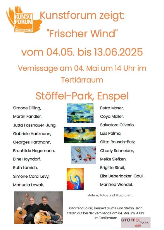 Das Kunstforum Westerwald lädt herzlich zur Eröffnung der Ausstellung „Frischer Wind“ ein, die vom 4. Mai bis zum 13. Juni 2025 im Tertiärraum des Stöffelparks in Enspel stattfindet.