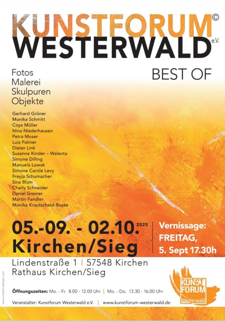 Zur Vernissage am Freitag, den 5. September 2025 um 17:30 Uhr in der Lindenstraße 1 in 57548 Kirchen sind alle Kunstinteressierte herzlich eingeladen. Die Laudatio wird die in Brachbach lebende Künstlerin Nina Niederhausen halten, die selbst zu den Mitgliedern des Kunstforums zählt. Sie hatte bereits vor zwei Jahren im Kirchener Rathaus Einblicke in ihr künstlerisches Schaffen gegeben, damals in einer vielbeachteten „Doppelausstellung“ gemeinsam mit ihrem Bruder Kai Niederhausen, der unter seinem Künstlernamen „Semor“ eine internationale Größe in der Graffiti-Szene ist.