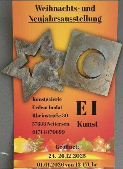 Erdem Imdat vom Kunstforum Westerwald e.V. stellt an Weihnachten und Neujahr aus Post Views: 55Beitrag veröffentlicht:20. Dezember 2025Beitrags-Kategorie:KunstWeitere Artikel ansehen Vorheriger BeitragMeike Siefken vom Kunstforum Westerwald e.V. lädt ein zum “Offenen Atelier”