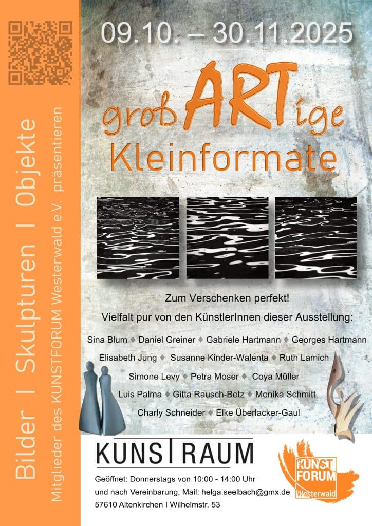 großARTige Kleinformate – Kunstforum Westerwald e.V. stellt aus von 9.10. bis 30.11.2024 Post Views: 45Beitrag veröffentlicht:12. November 2025Beitrags-Kategorie:KunstWeitere Artikel ansehen Vorheriger BeitragKultur-Café und Markt in Höchstenbach am 2. November 2025 mit 7 Mitgliedern des Kunstforum Westerwald e.V.