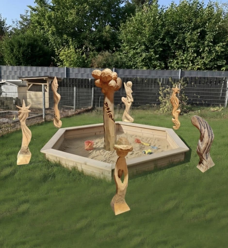Die 5 Stelen um den Sandkasten repräsentieren die 5 Kita-Gruppen, versammelt um das Himmelfeld im Mittelpunkt.